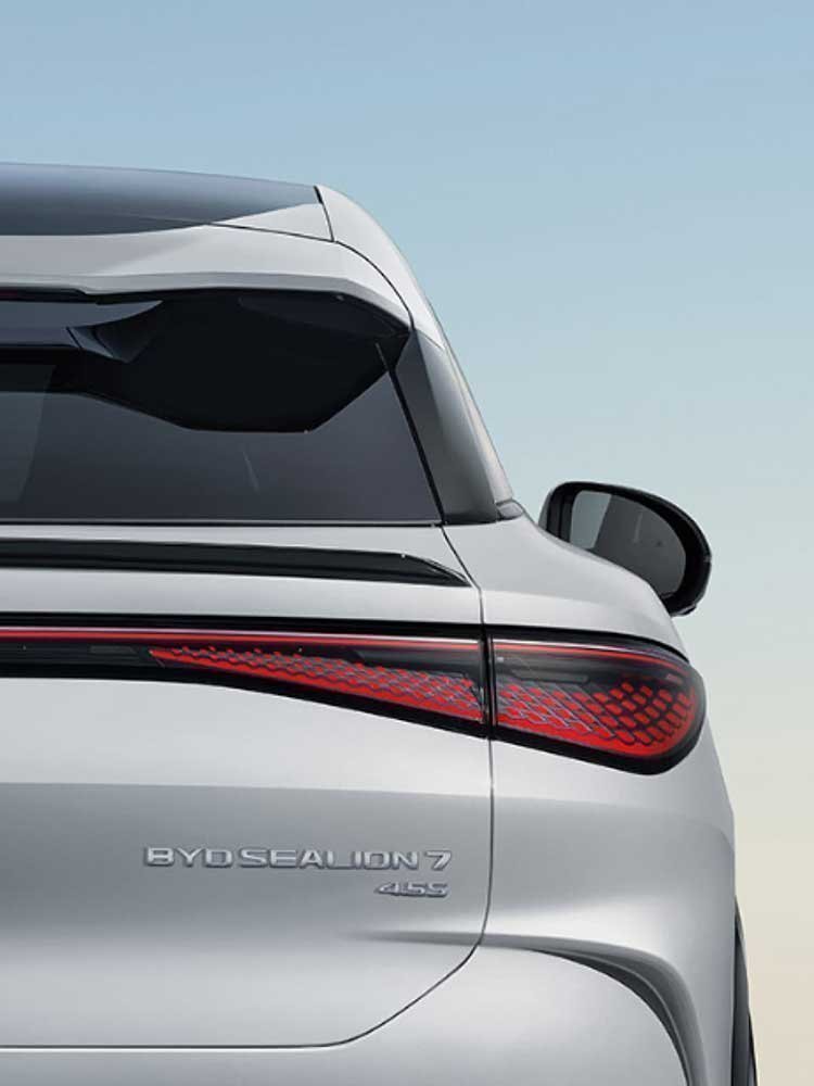 Lampu belakang BYD Sealion 7 dirancang dengan garis cahaya tipis yang menyatu dengan detail menyerupai tetesan air, menghadirkan kesan gerak yang lincah dan terinspirasi dari dinamika lautan. Tampilan ini memberikan sentuhan futuristik yang elegan, membuatnya terlihat modern, atraktif, dan mudah mencuri perhatian saat melintas.